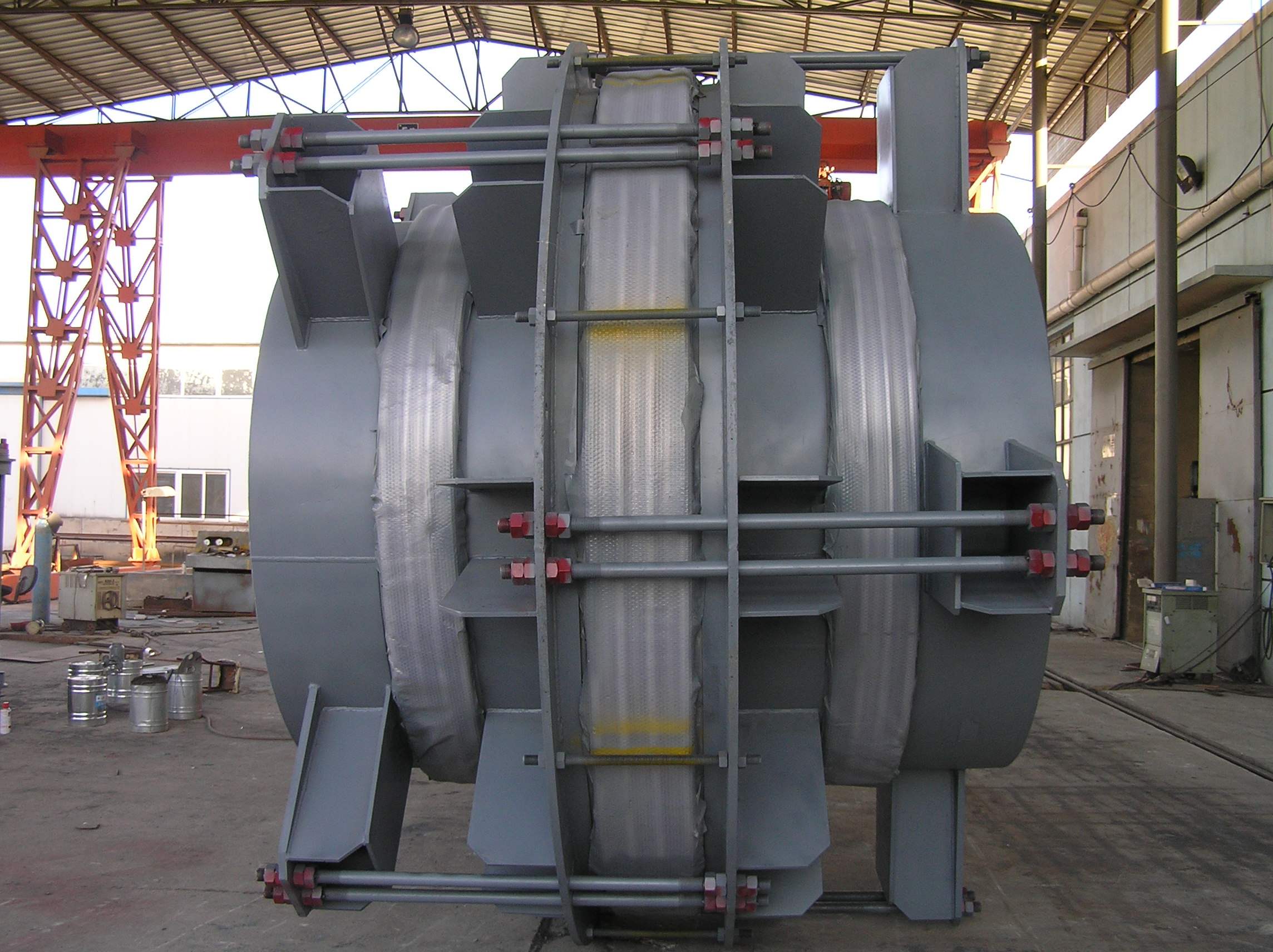 蒙皮由裏至外次序:高溫玻璃纖維布—聚四氟乙烯—高溫玻璃纖維布--聚四氟乙烯--氟膠布—不鏽鋼板鋼絲網片;此外法蘭盤內部靠導流板部位還需置放一層不鏽鋼板鋼絲網片,避免鍋爐中,法蘭盤內部大棚保溫被抽走。